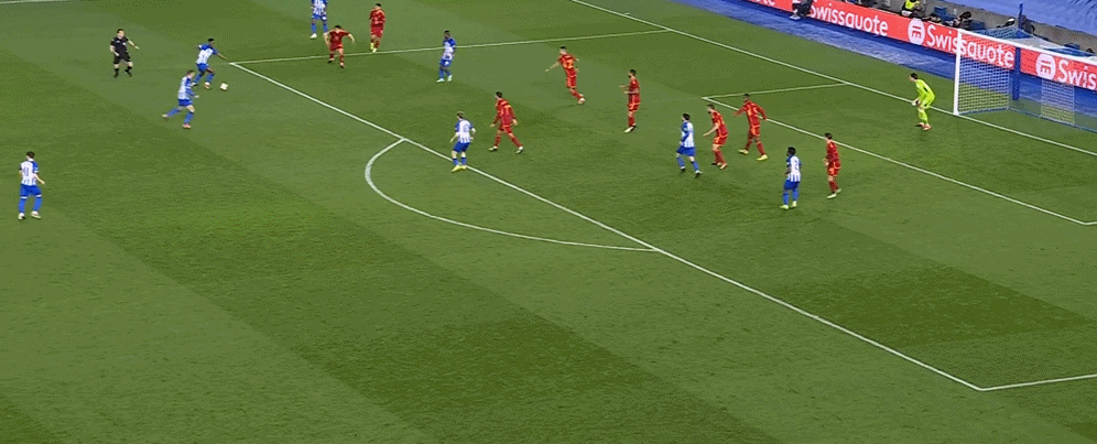 第37分钟,维尔贝克禁区前沿接应队友的回敲,晃开角度后起脚兜射,皮球窜入右上角网窝,布莱顿1-0领先!↓