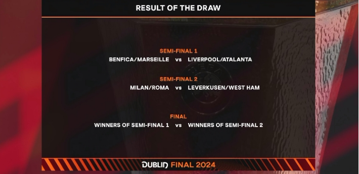 23/24赛季欧联杯1/4决赛抽签结果出炉,同时半决赛对阵和决赛的主队方也已经抽出。