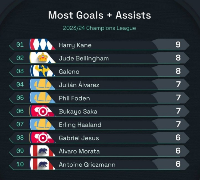 欧冠8强抽签仪式结束,数据网站Squawka也盘点了本赛季目前在欧冠参与进球榜(进球+助攻),其中凯恩9球居首。以下为具体榜单: