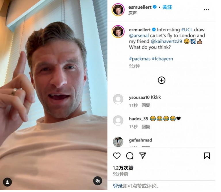 欧冠8强抽签结果已经全部出炉,拜仁将面对老对手阿森纳。穆勒也录制了视频,表示非常期待这次对决,还cue到了国家队队友哈弗茨。