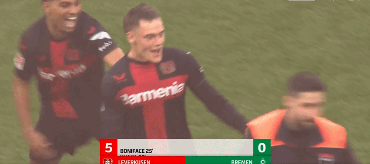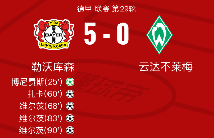 在北京时间4月14日,德甲联赛第29轮的比赛中,勒沃库森主场迎战云达不莱梅。上半场,霍夫曼造点,博尼费斯点射破门,阿德利小角度抽射击中门框。下半场,扎卡世界波破门,维尔茨上演帽子戏法,最终,勒沃库森5-0大胜不莱梅,提前5轮夺得队史首座德甲联赛冠军!