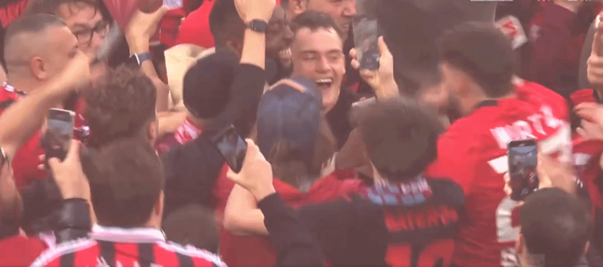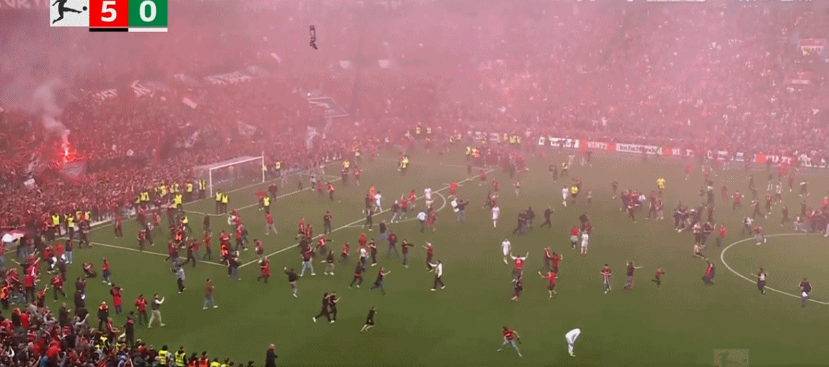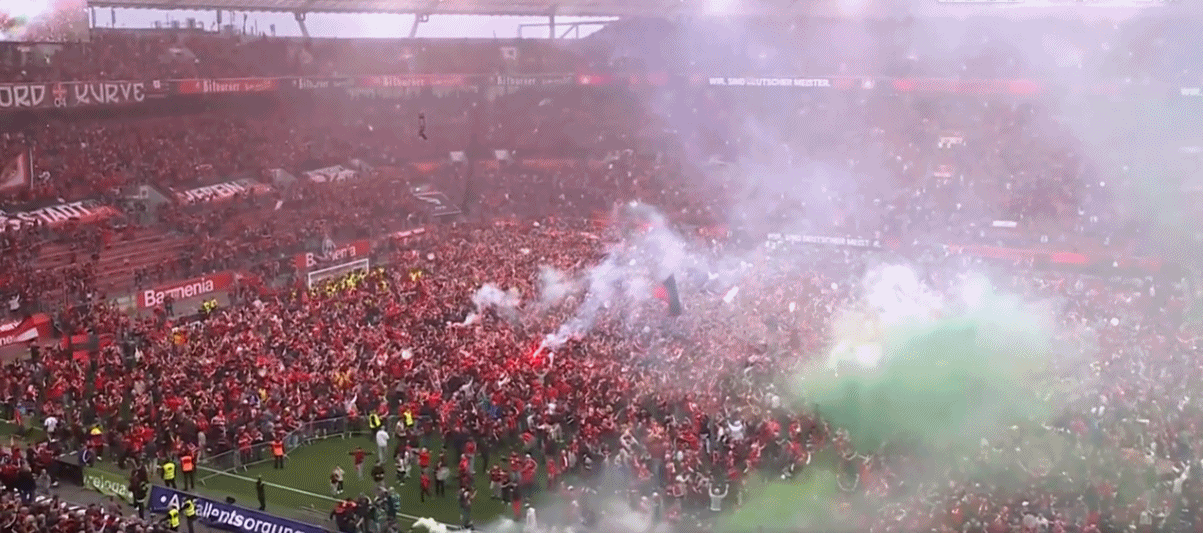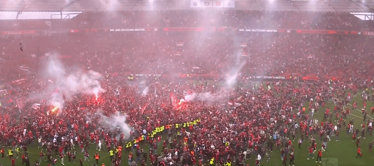 全场比赛结束,勒沃库森首夺德甲联赛冠军!球员、教练、球迷疯狂庆祝