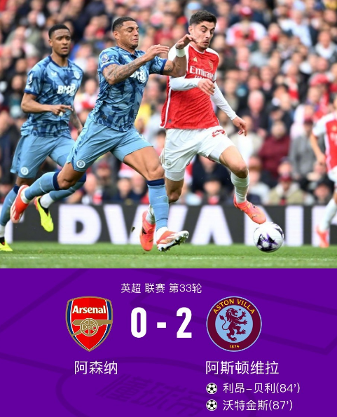 4月14日,英超联赛第33轮,阿森纳主场迎战阿斯顿维拉。上半场,哈弗茨打门被马丁内斯挡出,萨卡小角度爆射击中边网,沃特金斯断球低射中柱,特罗萨德近距离打门被马丁内斯神勇化解,萨卡内切兜射稍偏;下半场,蒂勒曼斯远射击中横梁后反弹中柱,热苏斯推射被扑,迪涅横传助攻贝利后点包抄破门打破僵局,若日尼奥传球失误后沃特金斯接长传单刀挑射入网。最终比分为阿森纳0-2阿斯顿维拉。