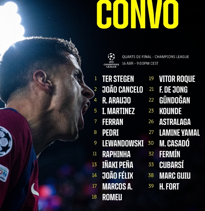 巴萨欧冠战巴黎名单,佩德里、菲利克斯在列,加维、巴尔德伤缺。
