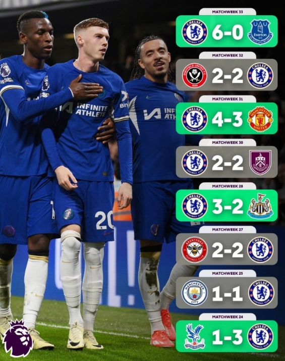 此役过后,切尔西近8场英超比赛保持不败,具体战绩4胜4平,英超官方账号在社交媒体上晒出切尔西近8场比赛的战绩,并指出蓝军上一次更长不败是在2021年3月份(10场不败)。