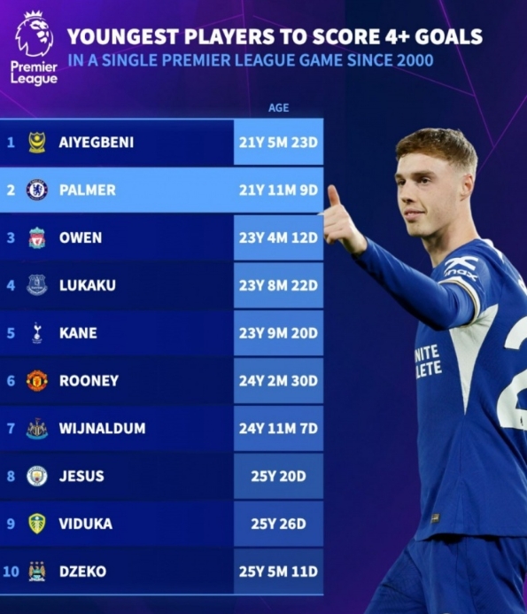 在本轮英超切尔西6-0大胜埃弗顿的比赛中,帕尔默上演大四喜。德转也盘点了自2000年在单场英超至少打进4球最年轻球员榜单,其中帕尔默位列次席,以下为具体情况: