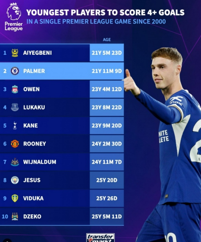 在本轮英超切尔西6-0大胜埃弗顿的比赛中,帕尔默上演大四喜。德转也盘点了自2000年在单场英超至少打进4球最年轻球员榜单,其中帕尔默位列次席,以下为具体情况: