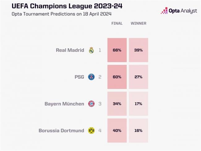 4月18日讯 欧冠1/4决赛战罢,皇马、拜仁、多特、巴黎进入四强,Opta超级计算机预测了各队的夺冠概率,皇马39%居首,多特16%最低。
