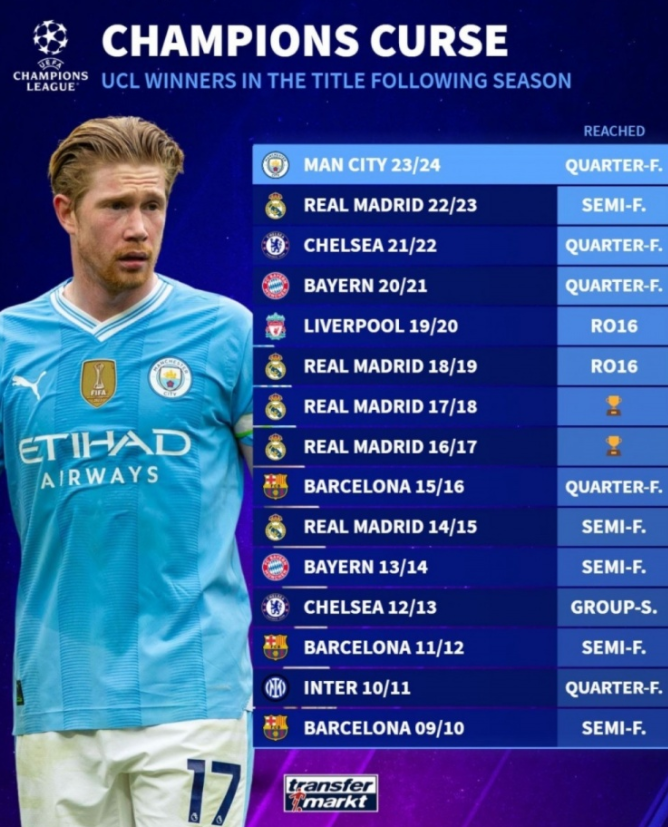 今日德转列出了自2009/10赛季以来历届欧冠卫冕冠军欧冠成绩,其中仅皇马完成两度卫冕,其余球队均未能卫冕成功。