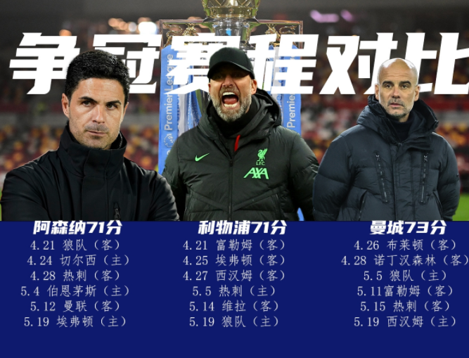 阿森纳本赛季仅剩英超单线作战,但赛程最难,需要面对切尔西、热刺、曼联,以及最后一轮面对可能需要力争保级的埃弗顿。