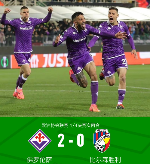 北京时间4月19日欧洲协会联赛1/4决赛次回合,佛罗伦萨主场对阵比尔森胜利。上半场双方互交白卷,耶德利奇卡发挥神勇,紫百合成铁匠轮番击中横梁和立柱,错失多次得分机会。下半场,卡杜回防犯规被红牌直接罚下,但紫百合仍然得势不得球。加时赛上半时,尼古拉斯-冈萨雷斯抓住角球机会补射破门打破僵局。加时赛下半时,伊科内助攻比拉吉破门锁定胜局。最终佛罗伦萨两回合总分2-0战胜比尔森胜利,成功晋级四强。
