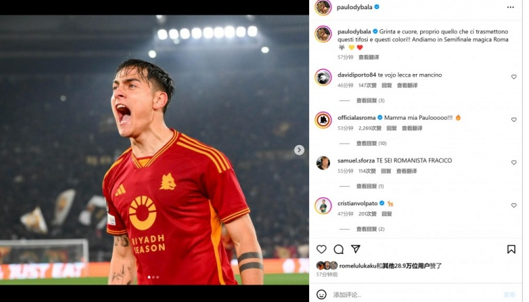 赛后迪巴拉也在个人社媒晒出本场庆祝进球的照片,配文写道:“勇气和信念,就是这些球迷们和这身球衣传递给我们的东西,让我们一同见证精彩的半决赛!”