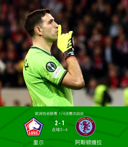 北京时间4月19日欧洲协会联赛1/4决赛次回合,里尔主场对阵阿斯顿维拉。上半场,古德蒙松传中,亚泽哲后点射门得分率先改写比分。下半场,哈康-哈拉尔德松角球开到前点,邦雅曼-安德烈头球后蹭将球打进将比分扩大。卡什补射破门扳回一城,将总比分扳平。加时赛双方战平,进入点球大战。本塔莱布和邦雅曼-安德烈的点球均被达米安-马丁内斯扑出,最终阿斯顿维拉点球大战4-3战胜里尔,成功晋级四强。