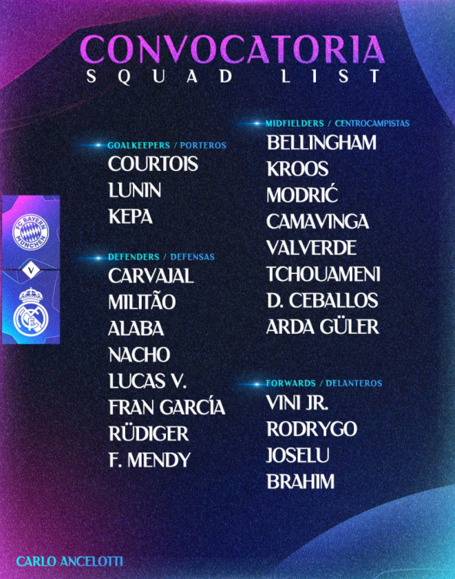 中场:贝林厄姆、克罗斯、莫德里奇、卡马文加、巴尔韦德、琼阿梅尼、塞巴略斯、居勒尔