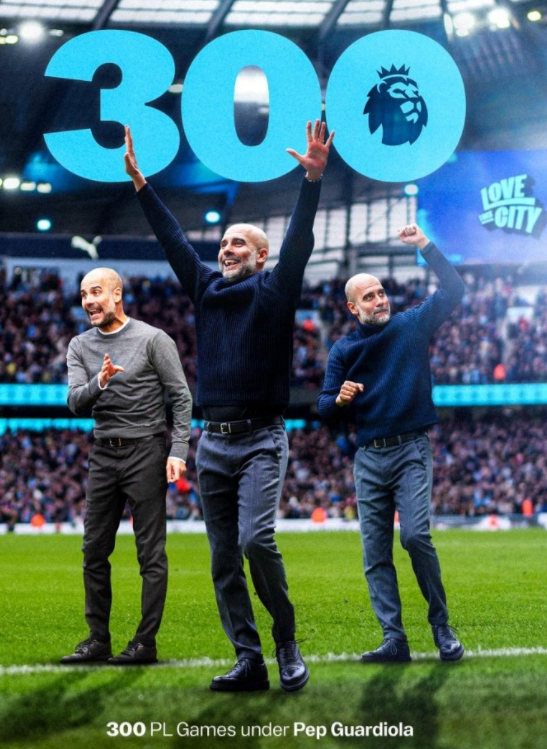 这是瓜迪奥拉执教曼城以来率队参加的第300场英超,在此前的299场比赛中,曼城的战绩为220胜41平38负,场均积分2.34分。曼城官方也晒出海报纪念这一特殊时刻。