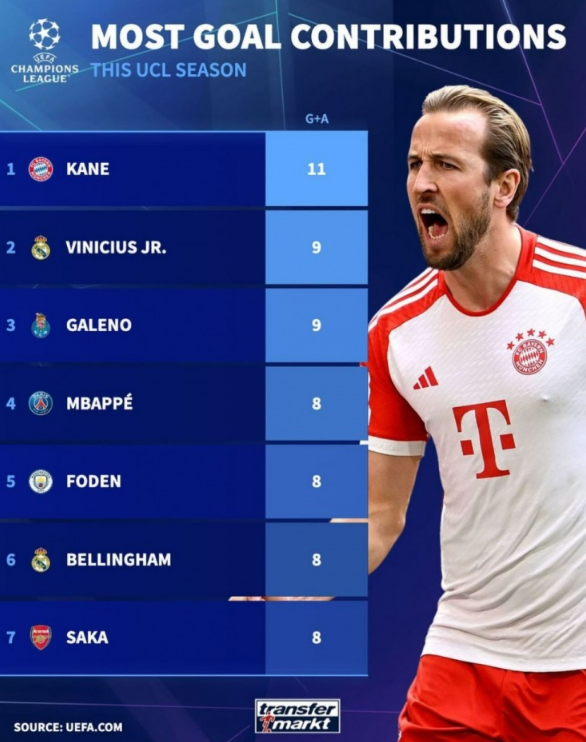 5月2日讯 本赛季欧冠半决赛结束首回合较量,德转也盘点了目前在本赛季欧冠参与进球榜,其中凯恩11球居首,以下为具体榜单: