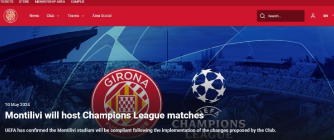 5月10日讯 赫罗纳官方消息,俱乐部已获来自欧足联的授权,(主场)蒙蒂利维球场将在24-25赛季举办欧冠比赛。