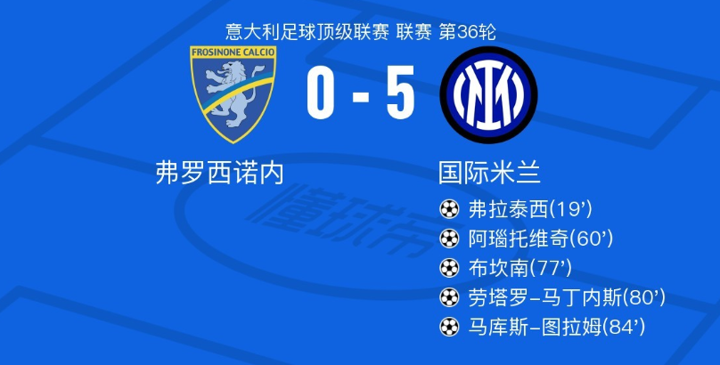 在意大利足球顶级联赛第36轮的比赛中,国际米兰客场挑战弗罗西诺内。上半场,马齐泰利远射被扑,弗拉泰西门前膝盖将球打进取得领先,布雷夏尼尼弧线球兜射被扑,谢迪拉内切打门击中门框;下半场,雷尼尔远射被扑,比塞克头球攻门中楣,弗拉泰西助攻阿瑙托维奇包抄破门,布坎南内切兜射入网,劳塔罗低射得手打破进球荒,劳塔罗助攻图拉姆单刀轻挑破门。最终比分是弗罗西诺内 0-5 国际米兰。