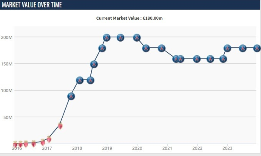 根据德转数据显示,姆巴佩在加盟大巴黎初期的身价为9000万欧元,随后一路上涨,最高达到了2亿欧元,目前他的身价为1.8亿欧元。