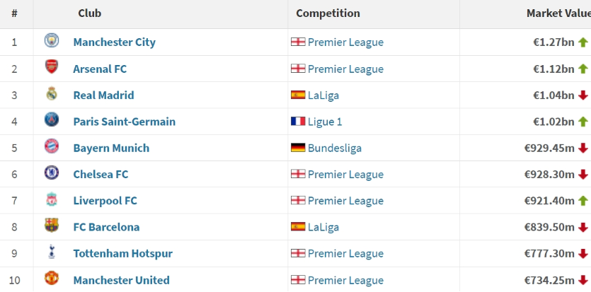 如果皇马最终得到姆巴佩,球队总身价将来到12.2亿欧元,超越阿森纳升至世界第2,仅次于曼城的12.7亿欧元。