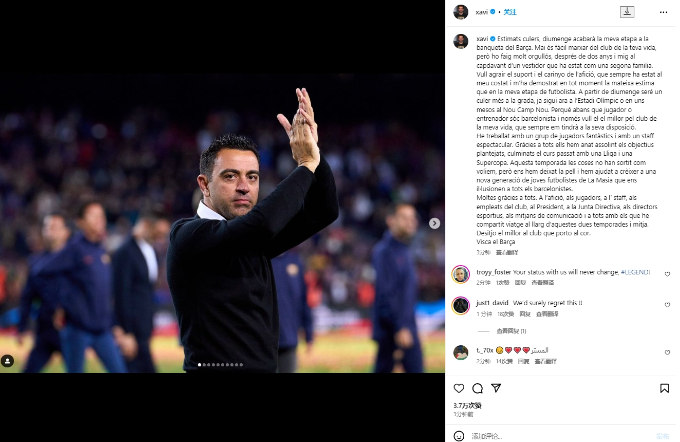我要感谢球迷们对我的支持和厚爱,他们一直陪伴在我身边,并始终如一地对我表示崇高的敬意,就像我还是一名球员时一样。从周日起,我将成为看台上的另一位巴萨球迷,无论是现在的奥林匹克球场,还是几个月后的诺坎普球场。因为在成为一名球员或教练之前,我是一名巴塞罗那球迷,我只想为我生命中的这家俱乐部带来最好的东西,它将永远为我所用。