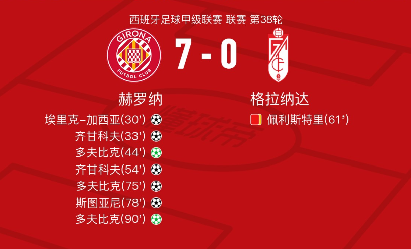 赫罗纳7-0格拉纳达,多夫比克戴帽+献助攻,齐甘科夫2射1传