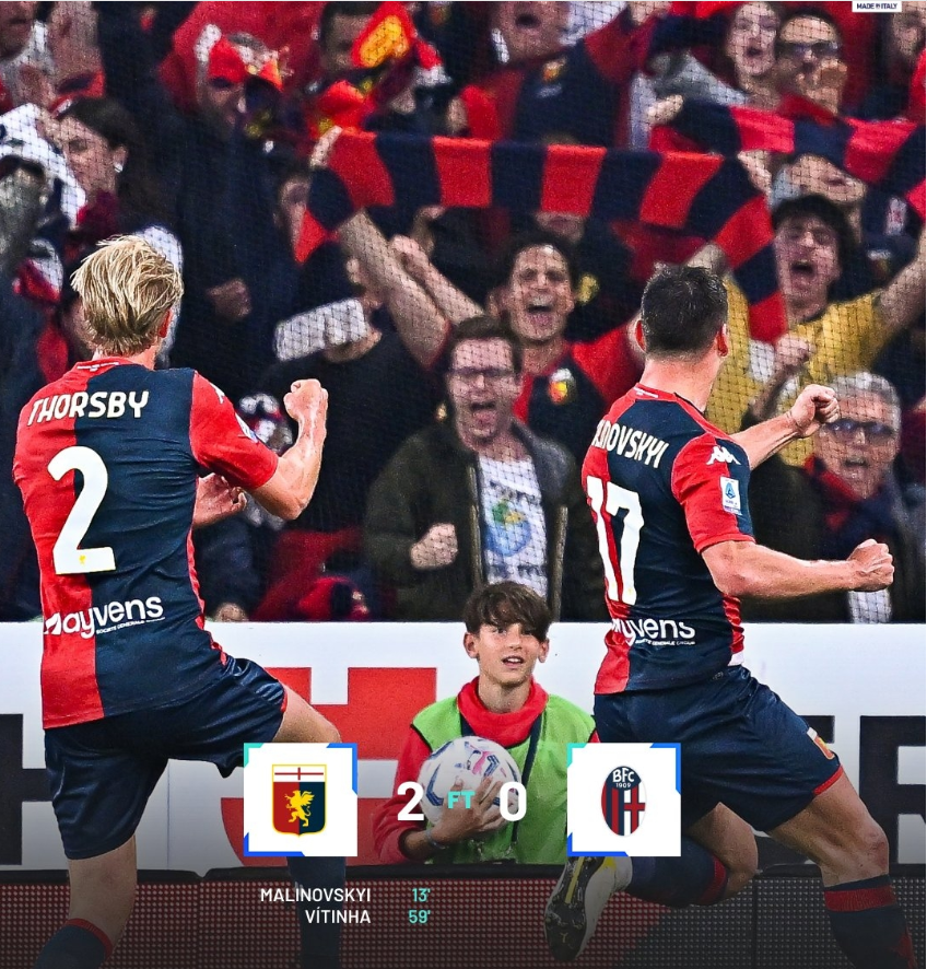 博洛尼亚0-2不敌热那亚,多赛两场只领先亚特兰大2分,罗马欧冠资格告急。