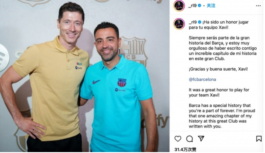 莱万写道:哈维,能够在你的球队中踢球是一份荣幸。