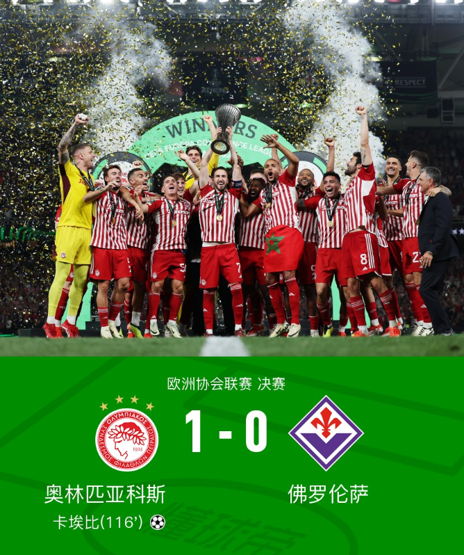 北京时间5月30日,奥林匹亚科斯在欧协联决赛对阵佛罗伦萨。上半场贝洛蒂射门偏出,米伦科维奇越位在先进球被吹无效,双方上半时战平。下半场米伦科维奇头球偏出,夸梅射门未打正部位被措拉基斯将球扑出。常规时间打平,双方进入加时赛。加时赛下半时,埃泽左路传中,卡埃比头球破门完成绝杀。最终奥林匹亚科斯1-0战胜佛罗伦萨,夺得欧协联冠军。