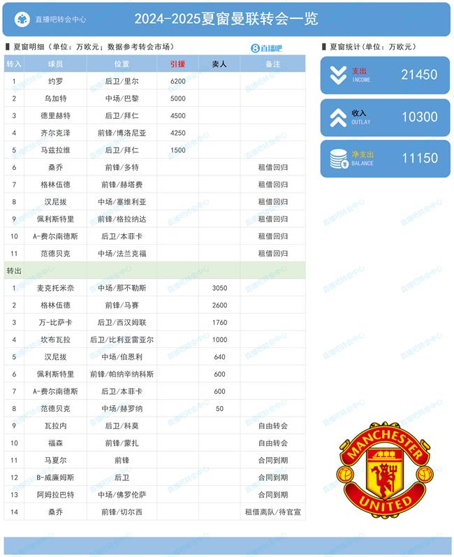 2024-2025赛季英超夏季转会窗口正式关闭。曼联今夏共花费2.145亿欧元引进了约罗、乌加特、德里赫特、齐尔克泽和马兹拉维;另外通过出售麦克托米奈、格林伍德、万-比萨卡等人回收1.03亿欧元.夏窗曼联净支出1.115亿欧元。