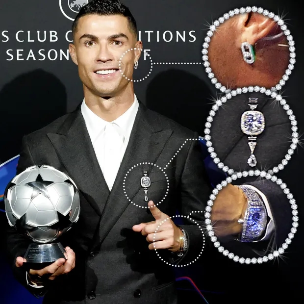 C罗所佩戴饰品中最贵的是一枚Messika Akh-Ba-Ka胸针,价值380万英镑,上面镶有一颗33克拉的钻石,由一颗稀有的110克拉原石切割而成。