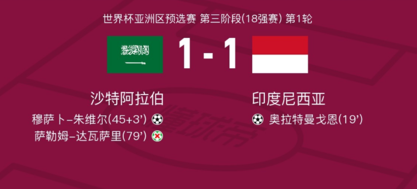 在世界杯亚洲区预选赛第三阶段的首轮比赛中,沙特阿拉伯与印度尼西亚展开了一场激烈的对决。比赛中,维坦-苏莱曼助攻奥拉特曼戈恩率先为球队取得进球,之后穆罕默德-卡努助攻穆萨卜-朱维尔兜射变线破门回敬一个,比赛接近尾声时,马尔滕-佩斯失误送出点球,随后将功补过将达瓦萨里主罚的点球扑出,随即全场战罢,双方以1-1的比分握手言和。