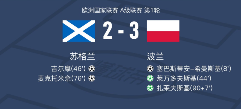 在欧洲国家联赛A级联赛的首轮比赛中,苏格兰迎战波兰。上半场,莱万助攻,希曼斯基远射率先破门。随后,扎莱夫斯基造点,莱万主罚命中。下半场,吉尔摩和麦克托米奈相继破门为苏格兰扳平比分。读秒阶段,扎莱夫斯基再次造点并亲自罚中完成绝杀。全场比赛结束,波兰3-2客胜苏格兰。