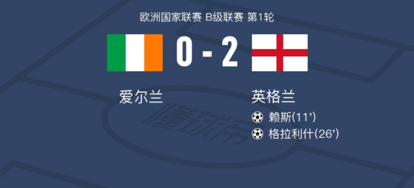 欧国联B级别比赛,英格兰2-0爱尔兰,赖斯传射,格拉利什进球。
