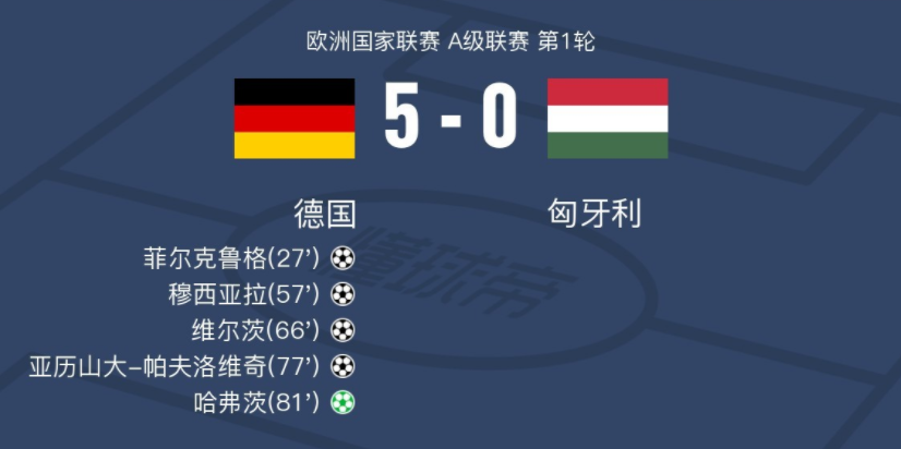 欧国联A级比赛,德国5-0大胜匈牙利,穆西亚拉1射3传,维尔茨传射。