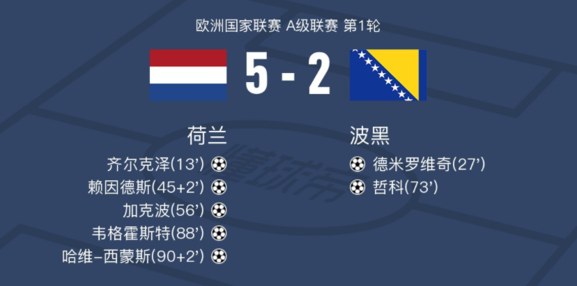 欧国联A级比赛,荷兰5-2波黑,齐尔克泽、赖因德斯双双传射,加克波破门。