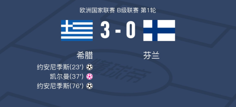 欧国联A级比赛希腊3-0大胜芬兰,约安尼季斯梅开二度,凯尔曼乌龙