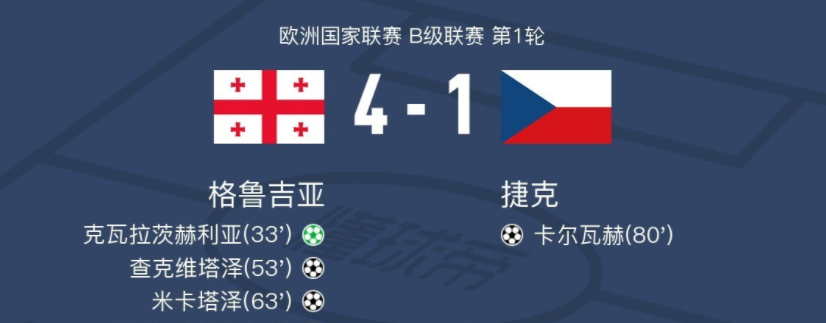欧国联A级比赛格鲁吉亚4-1捷克,KK传射,卡尔瓦赫复刻帕瓦尔经典进球