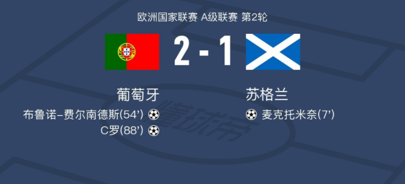 在欧洲国家联赛A级联赛的第二轮比赛中,葡萄牙与苏格兰展开了一场激烈的对决。上半场麦克托米奈头球破门,莱奥屡造险情,若塔头球被扑,门德斯远射差点破门,下半场B费远射破门扳平比分,菲利克斯单对单面对门将打门被,C罗门前推射空门绝杀。最终,葡萄牙以2-1战胜苏格兰,取得了这场比赛的胜利。