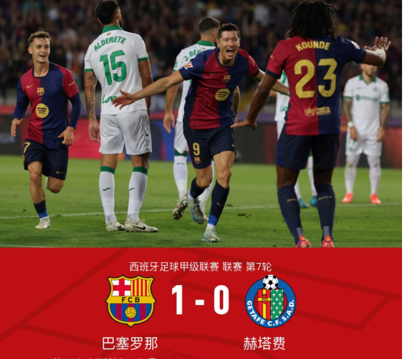 莱万破门7轮进7球,巴萨1-0赫塔费取得七连胜。