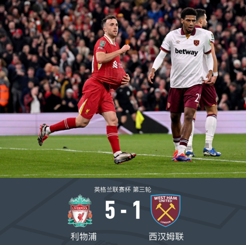 若塔、加克波双响,利物浦5-1逆转西汉姆晋级下一轮。
