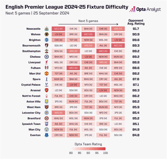 数据网站OPTA分析了英超各队未来5轮的赛程难易程度,纽卡赛程最为艰难,曼城赛程第二容易。