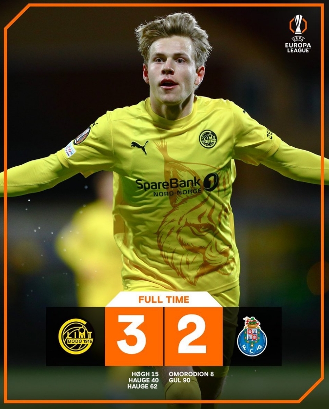 今天凌晨的欧联杯首轮比赛中,瑞典球队博德闪耀主场3-2逆转波尔图,主队中场海于格2射1传闪耀全场。