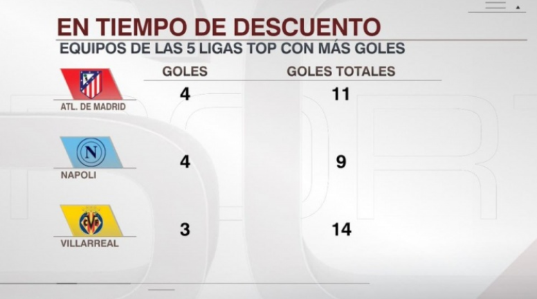 据ESPN统计,马竞本赛季联赛打进11球,其中4球来自于补时阶段,与那不勒斯并列五大联赛最多,比利亚雷亚尔补时阶段打进3球排名第三位。