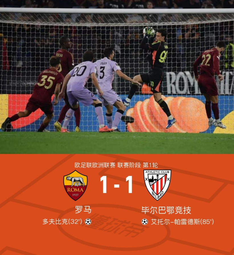 欧联-罗马1-1毕尔巴鄂竞技 多夫比克连场建功新帅2场不败