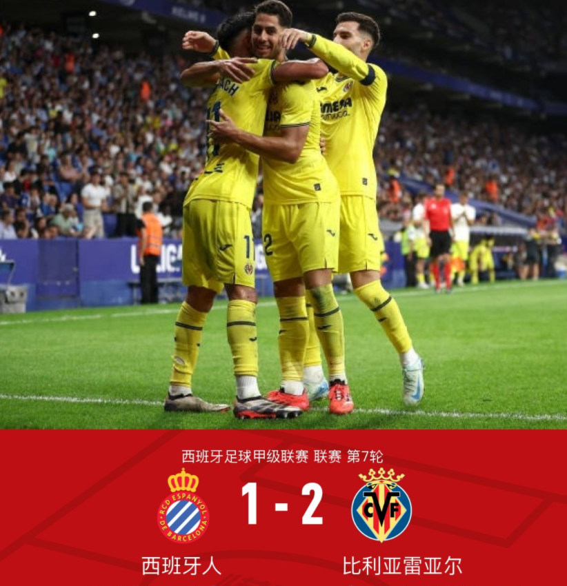 黄潜2-1逆转西班牙人,阿约塞-佩雷斯双响,巴埃纳两助攻