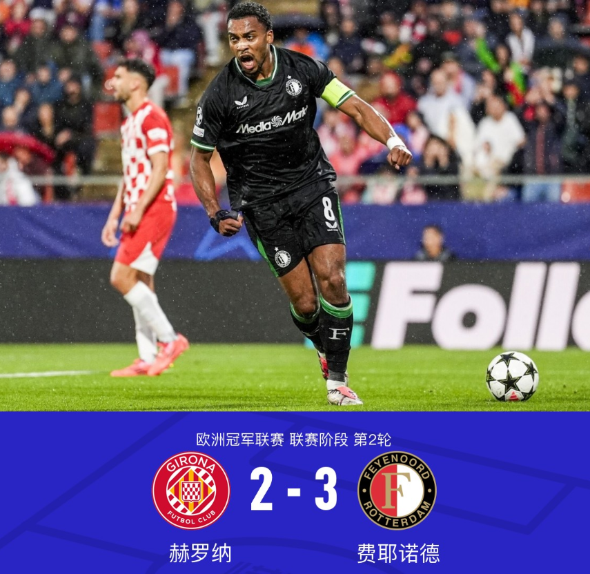 第34分钟,费耶诺德前场断球,派尚助攻米兰博破门,费耶诺德2-1赫罗纳