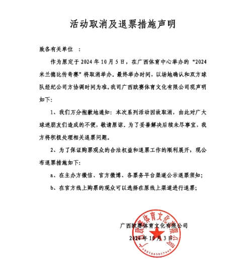 作为原定于2024年10月5日,在广西体育中心举办的“2024米兰德比传奇赛”将取消举办。最终举办时间,以场地确认和双方球队经纪公司方协调时间为准。