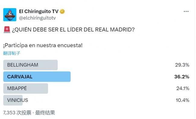 西班牙六台在社交媒体上票选皇马领袖球员,候选为卡瓦哈尔、贝林厄姆、姆巴佩和维尼修斯,网友总计进行了7353次投票,卡瓦哈尔支持率36.2%最高。