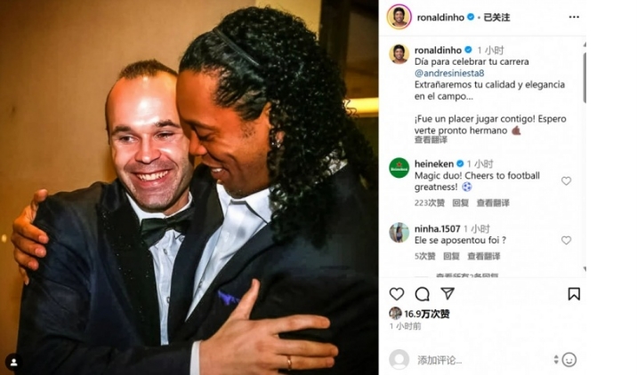 传奇球星伊涅斯塔正式宣布退役,前队友小罗也在个人社媒晒出两人昔日合影为其送上祝福。